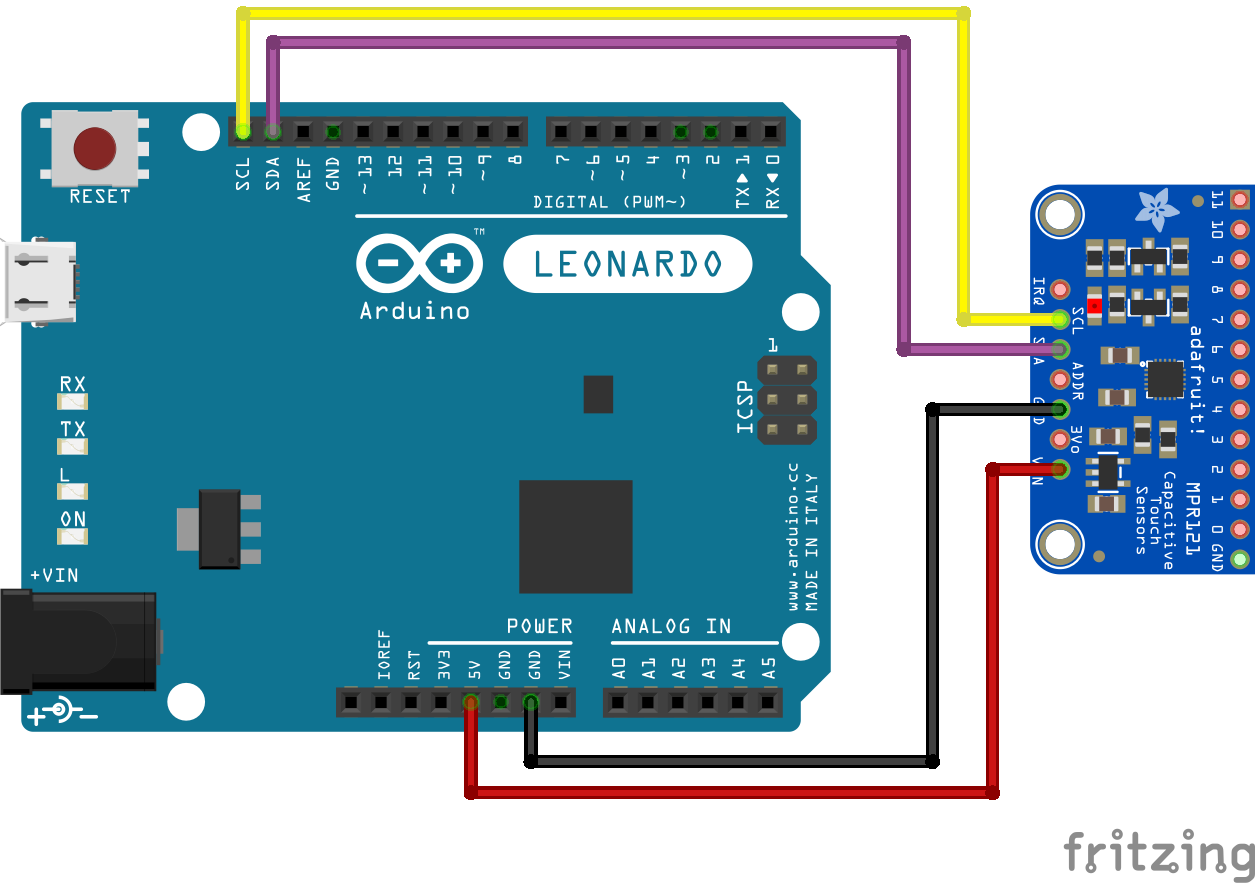 Wiring is pretty simple, it's an I2C component so it's relatively standard. mpr121-circuit.png
